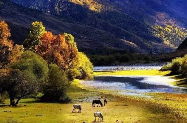 神奇的光線,無垠的草原,彎彎的小溪,金黃的柏楊,山巒連綿起伏,藏寨散落其間,牛羊安詳?shù)爻圆荨@就是新都橋,令人神往的"光與影的世界"、"攝影家的天堂"。