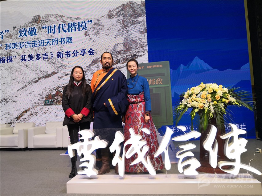 在分享會(huì)舞臺(tái)的一側(cè),靜置著書(shū)籍《雪線信使——“時(shí)代楷?!逼涿蓝嗉贩糯蠛蟮姆饷?。封面上,其美多吉、藍(lán)天與雪山相得益彰,構(gòu)成了一幅獨(dú)具特色的畫(huà)面。