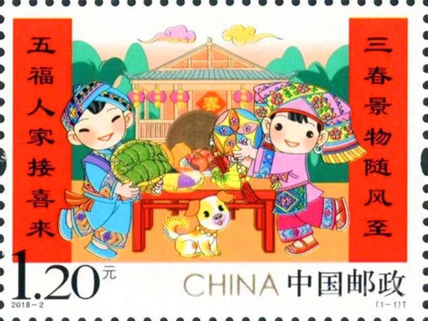 彰顯中華民族特有人情味的拜年郵票。拜年是我國春節(jié)的主要習(xí)俗,是中華民族優(yōu)秀的傳統(tǒng)文化,是人與人之間情感凝聚和維系的重要禮節(jié),具有獨特人情味。中國郵政從2015年至2019年連續(xù)發(fā)行了五組“拜年”系列郵票。2015年中國郵政發(fā)行的第一組《拜年》郵票,以其獨特的卡通風(fēng)格和濃郁的民俗特色,展現(xiàn)了人們過大年,拜大年時的喜悅場景。2018年正好是廣西壯族自治區(qū)成立六十周年,中國郵政發(fā)行 《拜年》郵票,畫面展現(xiàn)了壯家人過年時熱情好客的場景,桌子上擺放著柚子、香蕉、五色飯等當?shù)靥厣褪澄?,打開的石榴籽粒飽滿、顆顆相抱,正如我國56個民族緊密團結(jié)在一起,形象貼切地體現(xiàn)了習(xí)近平總書記提出的“各民族要像石榴籽那樣緊緊抱在一起”的教導(dǎo)。 2019年春節(jié)恰逢與藏歷新年同一天,中國郵政發(fā)行的《拜年》郵票,郵票主圖畫面上“歡歡”與“喜喜”兩名藏族兒童,身穿藏族的盛裝,在布達拉宮前載歌載舞,整個畫面展現(xiàn)了藏族同胞歡快愉悅,喜慶新年的畫面,同時也表達了全國各族人民在黨的領(lǐng)導(dǎo)下,幸福生活,共筑中國夢的美好寓意。