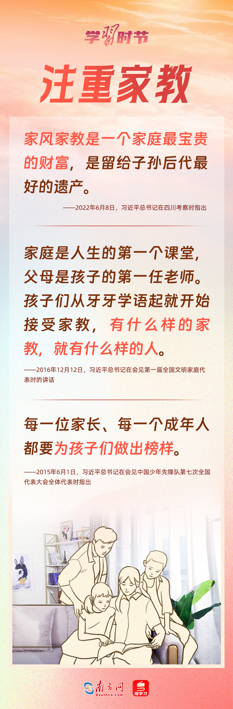 5月15日是國際家庭日。家庭是社會的細(xì)胞,是國家發(fā)展、民族進(jìn)步、社會和諧的重要基點。習(xí)近平總書記心中始終牽掛著千家萬戶,高度重視家庭、家教和家風(fēng)建設(shè),強調(diào)不論時代發(fā)生多大變化,不論生活格局發(fā)生多大變化,我們都要重視家庭建設(shè),注重家庭、注重家教、注重家風(fēng)。家庭和睦、家教良好、家風(fēng)端正,子女才能健康成長,社會才能健康發(fā)展。