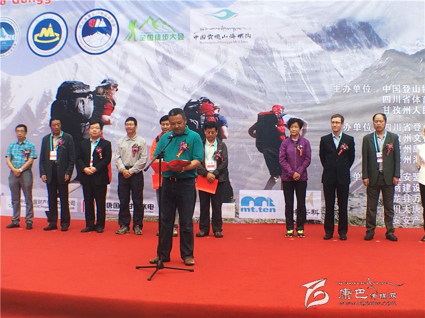 開幕式上,四川省體育局副局長蔣顯倫為2016中國•甘孜環(huán)貢嘎山百公里國際山地戶外運(yùn)動(dòng)挑戰(zhàn)賽暨徒步大會(huì)作致辭。
