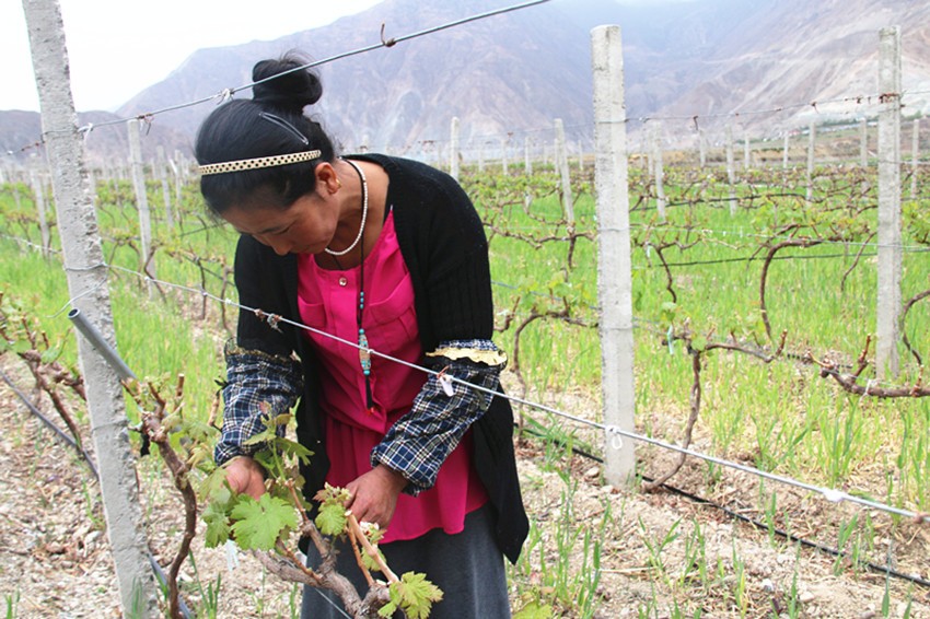 四郎吉村地處半山腰,干旱缺水、土地貧瘠,村民們以前都靠種植青稞來獲得收入。“過去,由于缺技術(shù)、葡萄的品質(zhì)不高,我家種的釀酒葡萄賣不出去;現(xiàn)在,太陽魂公司承包了村民們的葡萄園,成立專業(yè)合作社,統(tǒng)一種植、統(tǒng)一管理、統(tǒng)一經(jīng)營,既規(guī)避了風(fēng)險,又為大家?guī)砹撕芎玫慕?jīng)濟效益。”對于村民仁青志瑪來說,生活的好轉(zhuǎn)都起因于小小的葡萄。
