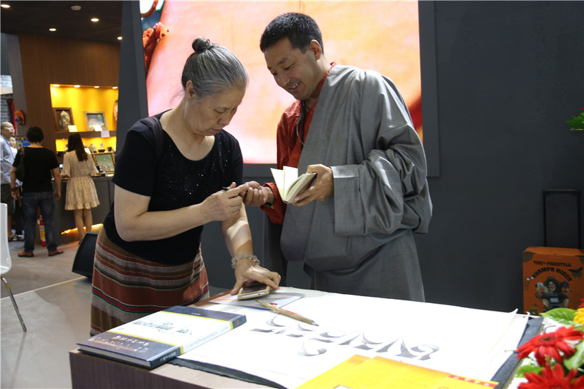 而在同一地點(diǎn)的另一側(cè),省級藏文書法傳承人巴松鄧珠的藏文書法也吸引著眾多愛好書法市民前來觀賞,還有的與他合影。“指導(dǎo)過我的書法家非常多,他們不僅給了我許多寶貴的意見,更重要的是給了我信心和動(dòng)力,讓我堅(jiān)持寫書法,并成為康體藏文書法的傳承人。”巴松鄧珠說,這次能夠得到州委、州政府搭建的平臺,我會(huì)珍惜好這次難得的機(jī)遇,把作品展示好、宣傳好,讓全國各地的人們更多地了解我州民族文化。