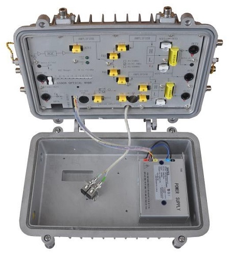 GSDON 型光站,二路射頻放大,雙向配置,SC/APC, 公制 F 頭,60VAC 供電,FP 激光器,1310nm 波長, 0dBm 輸出功率